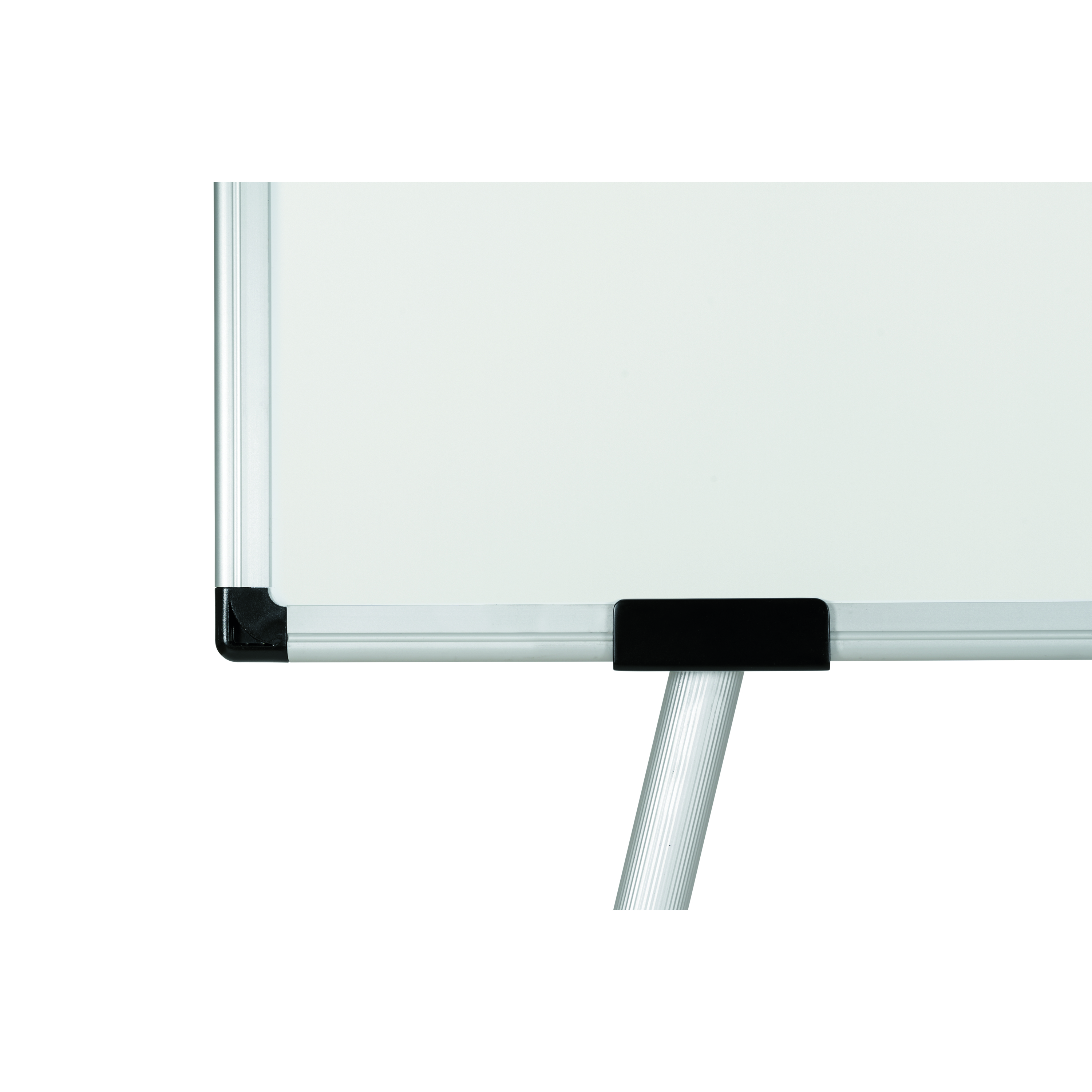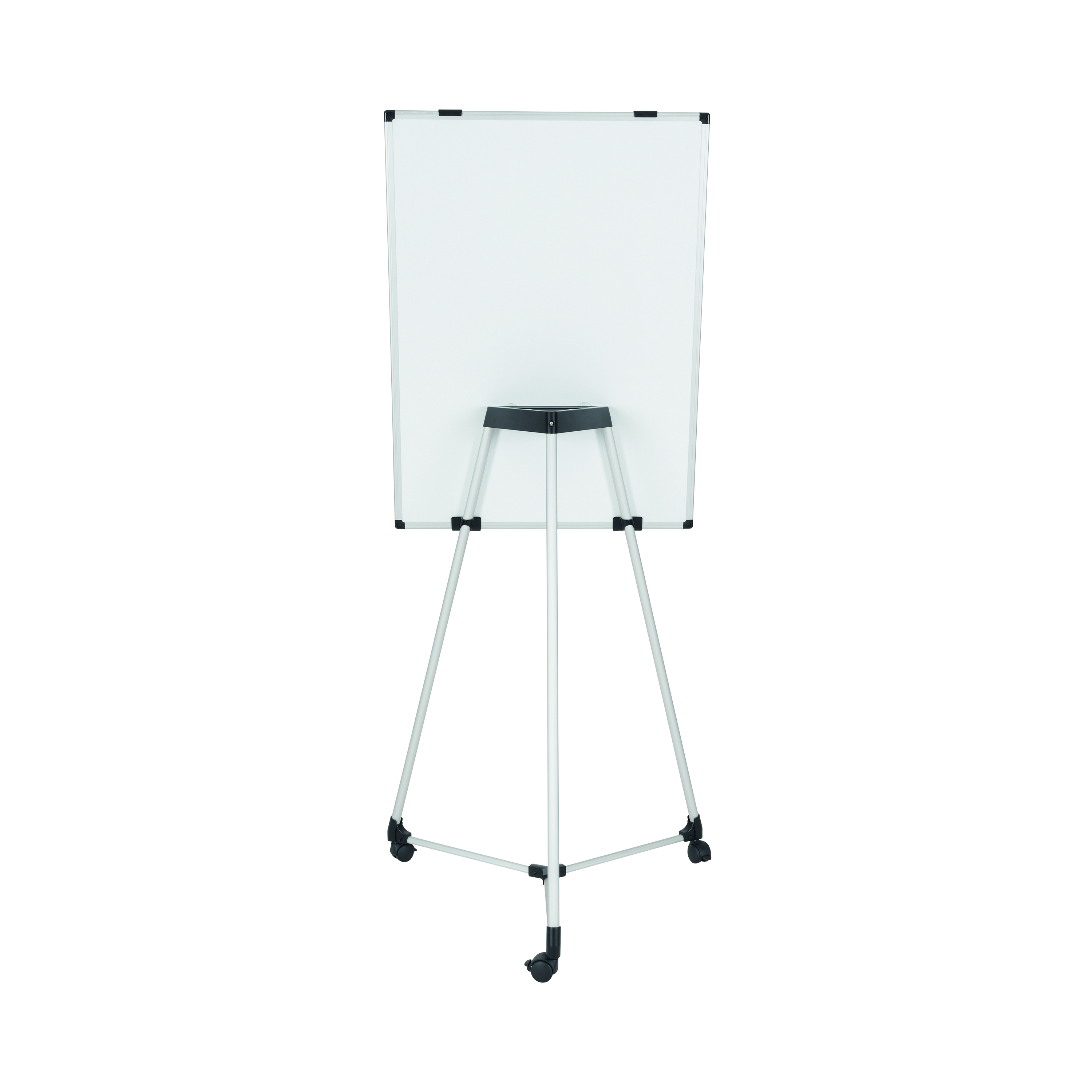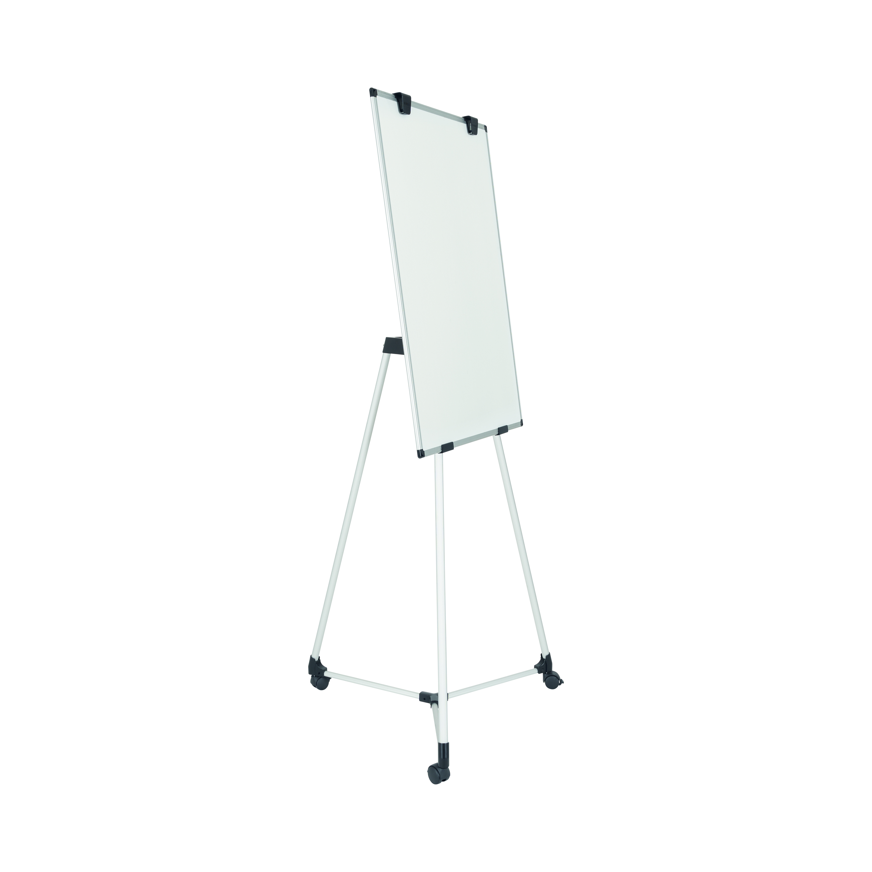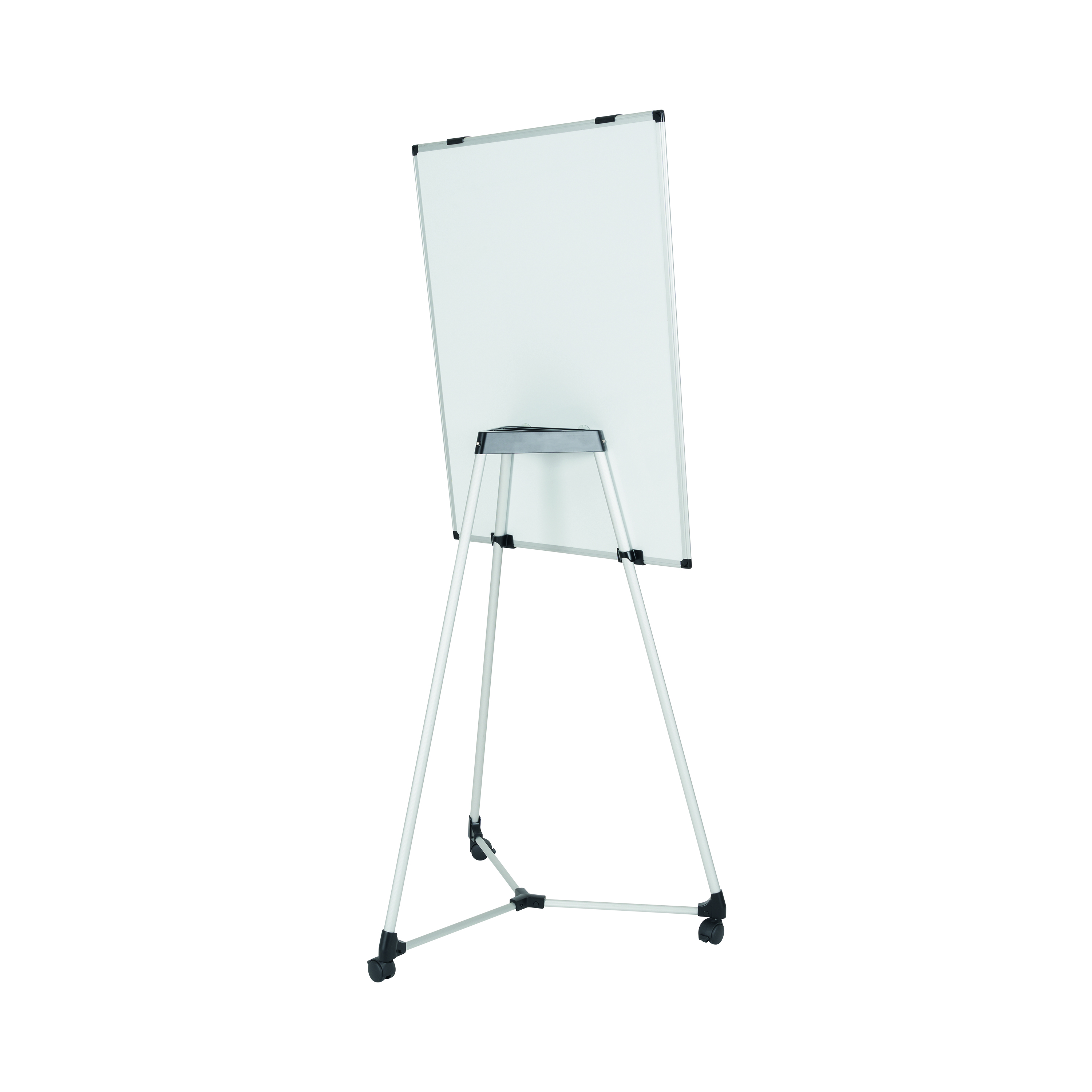 Bi-Office Earth Kyoto Flipchart Mobile Non-Magnetic Easel with an aluminium frame is portable and versatile, making it the right choice for dynamic companies to improve work efficiency and manage space according to their needs. Take it to any workspace, office, or meeting room to brainstorm and present ideas. its easy to move to any required location because of its lightweight and simple yet sturdy structure, and with the mobile kits 3 locking casters the mobility is even further improved. When not in use, it can easily be packed away to save space. You can write or draw on a flipchart pad over the whiteboard surface, or just simply write, erase and rewrite directly on the board itself. The drywipe surface is suited for moderate use, easy to write on, and clean. Additionally, the board height can be adjusted on the 2 board supports placed on the legs and easily set to a comfortable position for the user. The 3 aluminium legs are sturdily connected together on top with a triangular plastic connector, that also serves as the accessories tray for the board markers, eraser, magnets, etc., and the back support for the board. Adjustable pad clamps to use with flipcharts are also included. Made from recycled materials, the Earth Kyoto easel was designed to meet the principles of a circular economy under the environmental sustainability model. This easel lifespan has been greatly increased: you can reuse and repurpose the detachable recycled parts as much as possible. They can be easily replaced or fixed if they get damaged. This also means you can customise it as you please and use the same structure with boards of different sizes and other accessories. Protecting our planet starts with each one of us: making sustainable choices is how you change the world for the better.