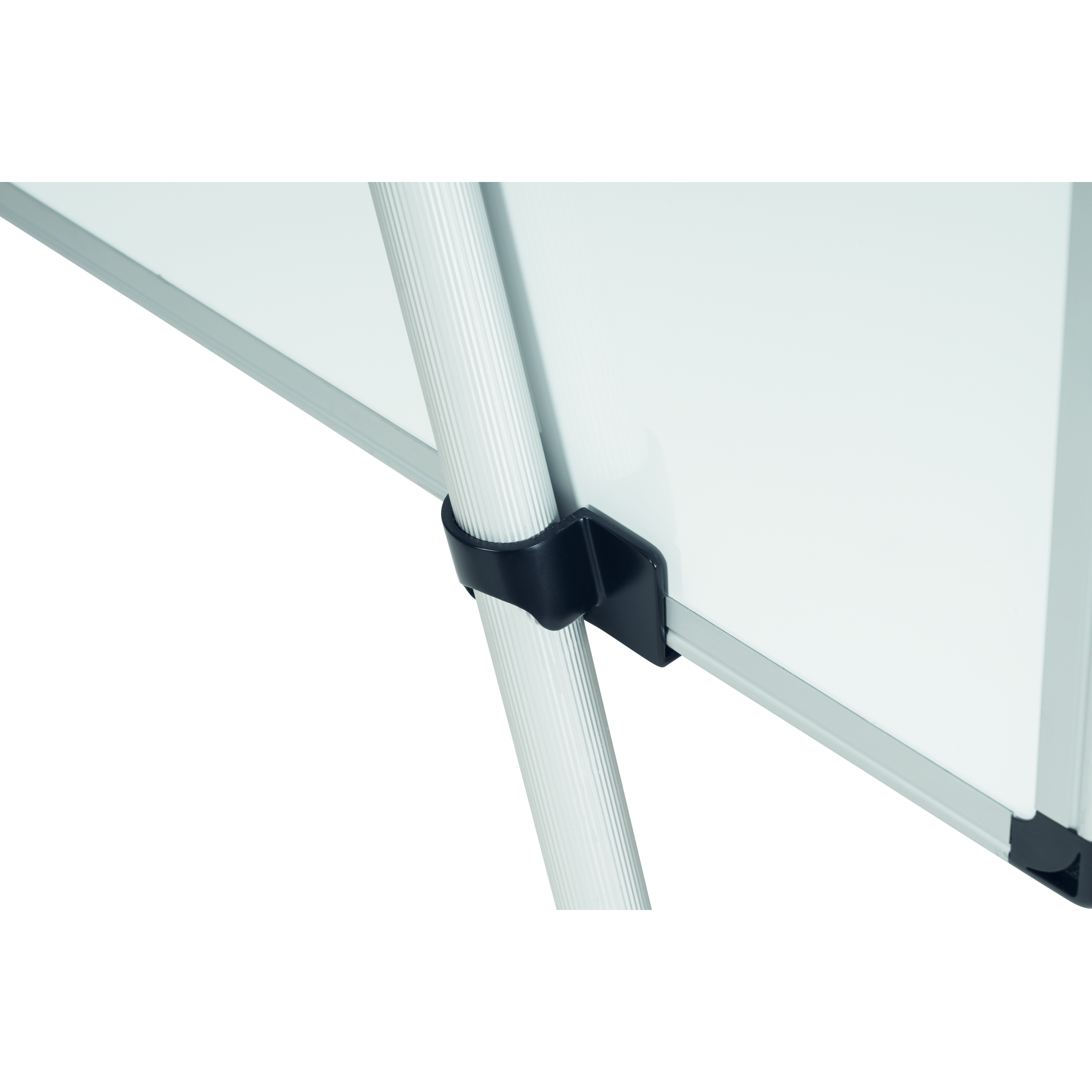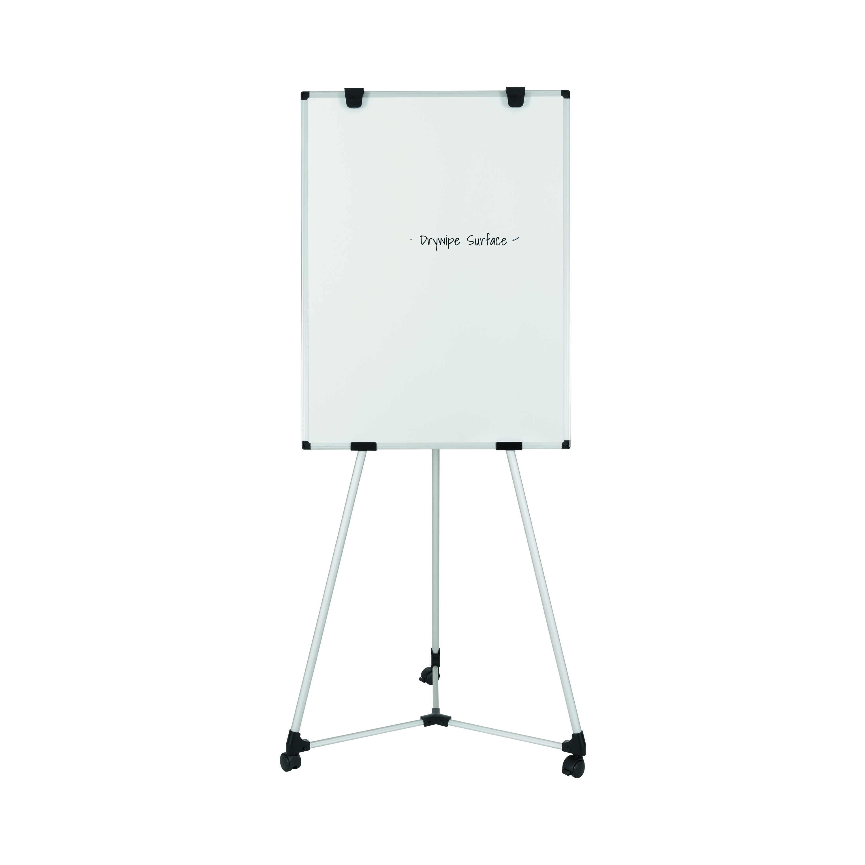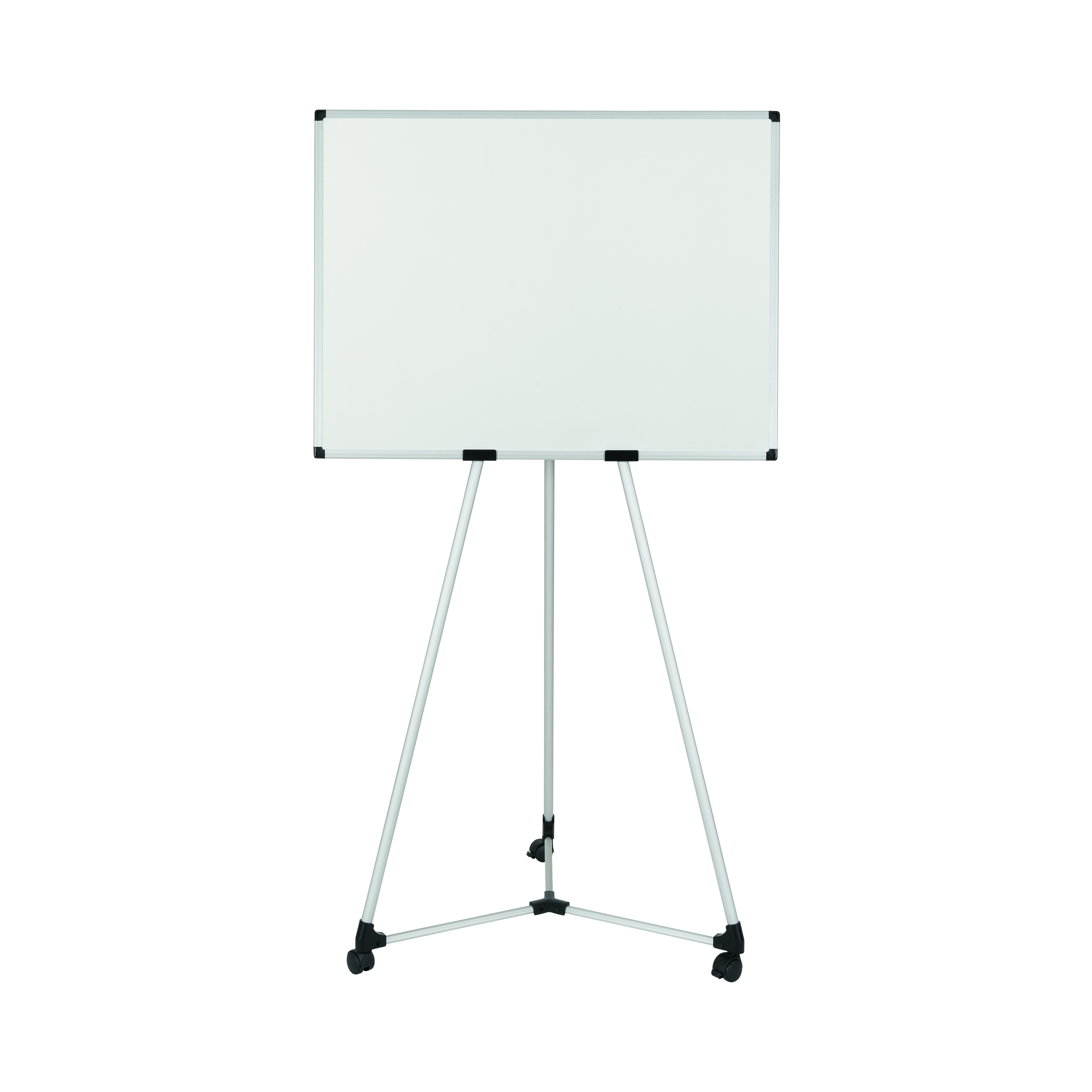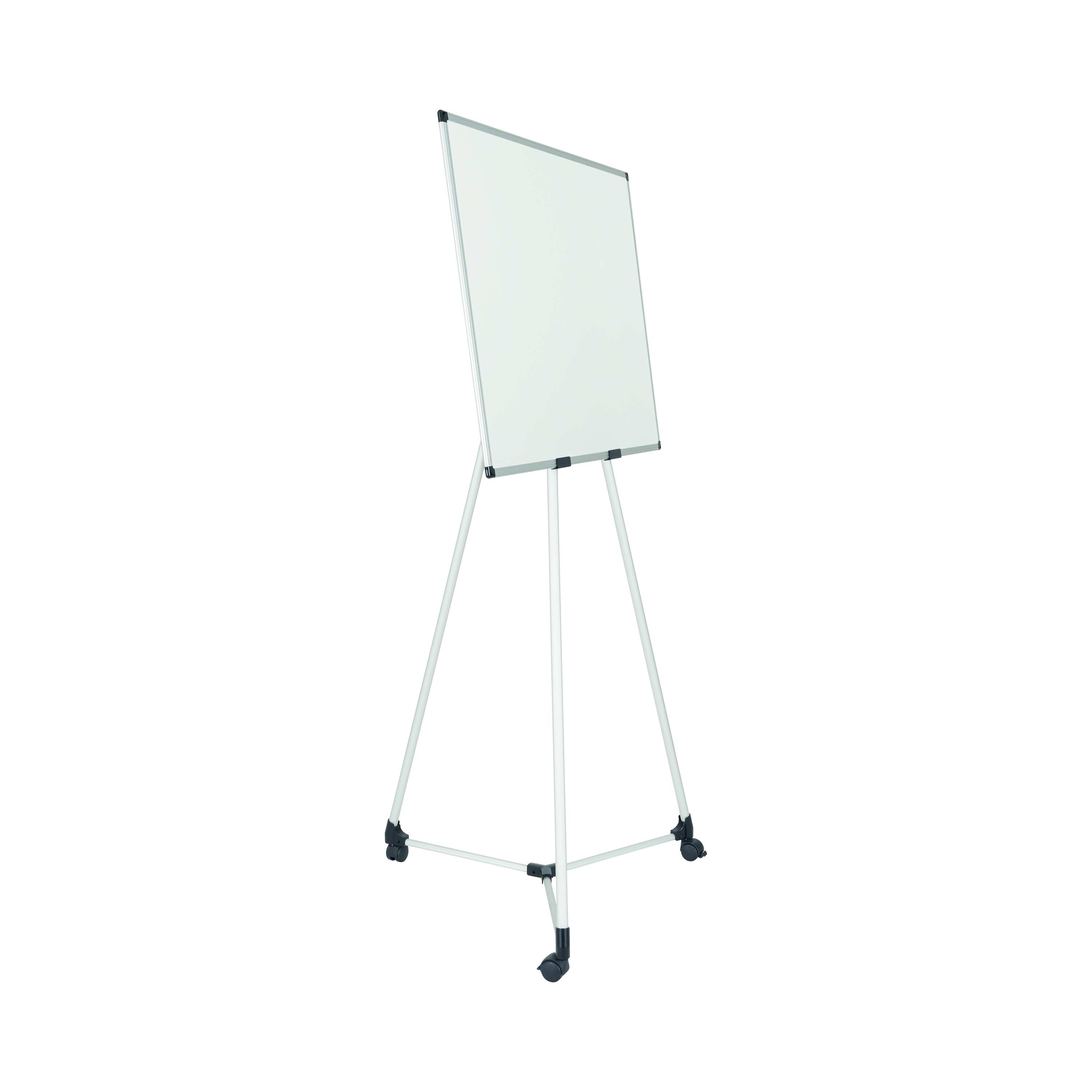 Bi-Office Earth Kyoto Flipchart Mobile Non-Magnetic Easel with an aluminium frame is portable and versatile, making it the right choice for dynamic companies to improve work efficiency and manage space according to their needs. Take it to any workspace, office, or meeting room to brainstorm and present ideas. its easy to move to any required location because of its lightweight and simple yet sturdy structure, and with the mobile kits 3 locking casters the mobility is even further improved. When not in use, it can easily be packed away to save space. You can write or draw on a flipchart pad over the whiteboard surface, or just simply write, erase and rewrite directly on the board itself. The drywipe surface is suited for moderate use, easy to write on, and clean. Additionally, the board height can be adjusted on the 2 board supports placed on the legs and easily set to a comfortable position for the user. The 3 aluminium legs are sturdily connected together on top with a triangular plastic connector, that also serves as the accessories tray for the board markers, eraser, magnets, etc., and the back support for the board. Adjustable pad clamps to use with flipcharts are also included. Made from recycled materials, the Earth Kyoto easel was designed to meet the principles of a circular economy under the environmental sustainability model. This easel lifespan has been greatly increased: you can reuse and repurpose the detachable recycled parts as much as possible. They can be easily replaced or fixed if they get damaged. This also means you can customise it as you please and use the same structure with boards of different sizes and other accessories. Protecting our planet starts with each one of us: making sustainable choices is how you change the world for the better.