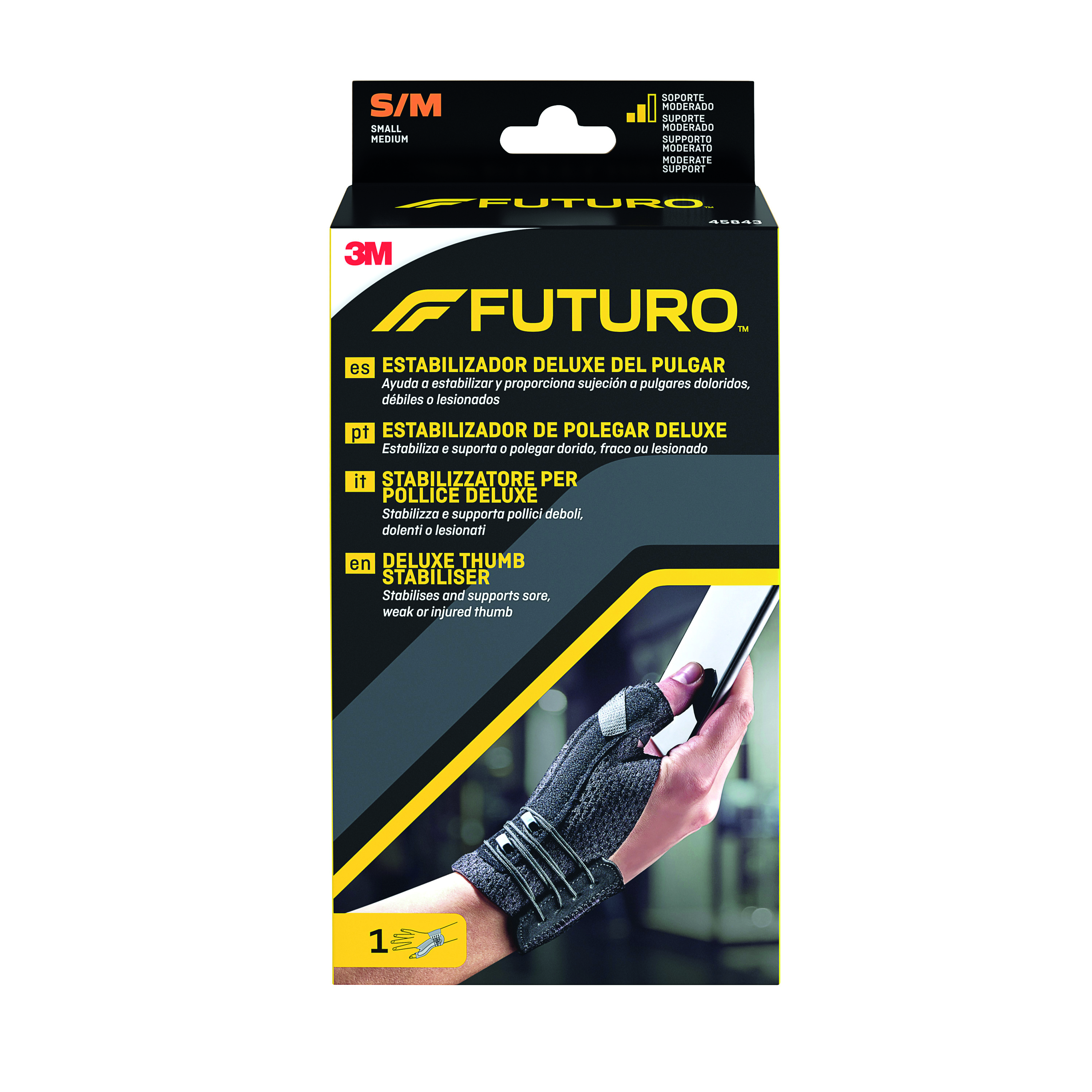 Futuro Deluxe Thumb Stabilizer is designed to stabilize and support sore, weak or injured lower thumb joints. Helps stabilize the lower thumb joints. Allows free movement of the remaining fingers.