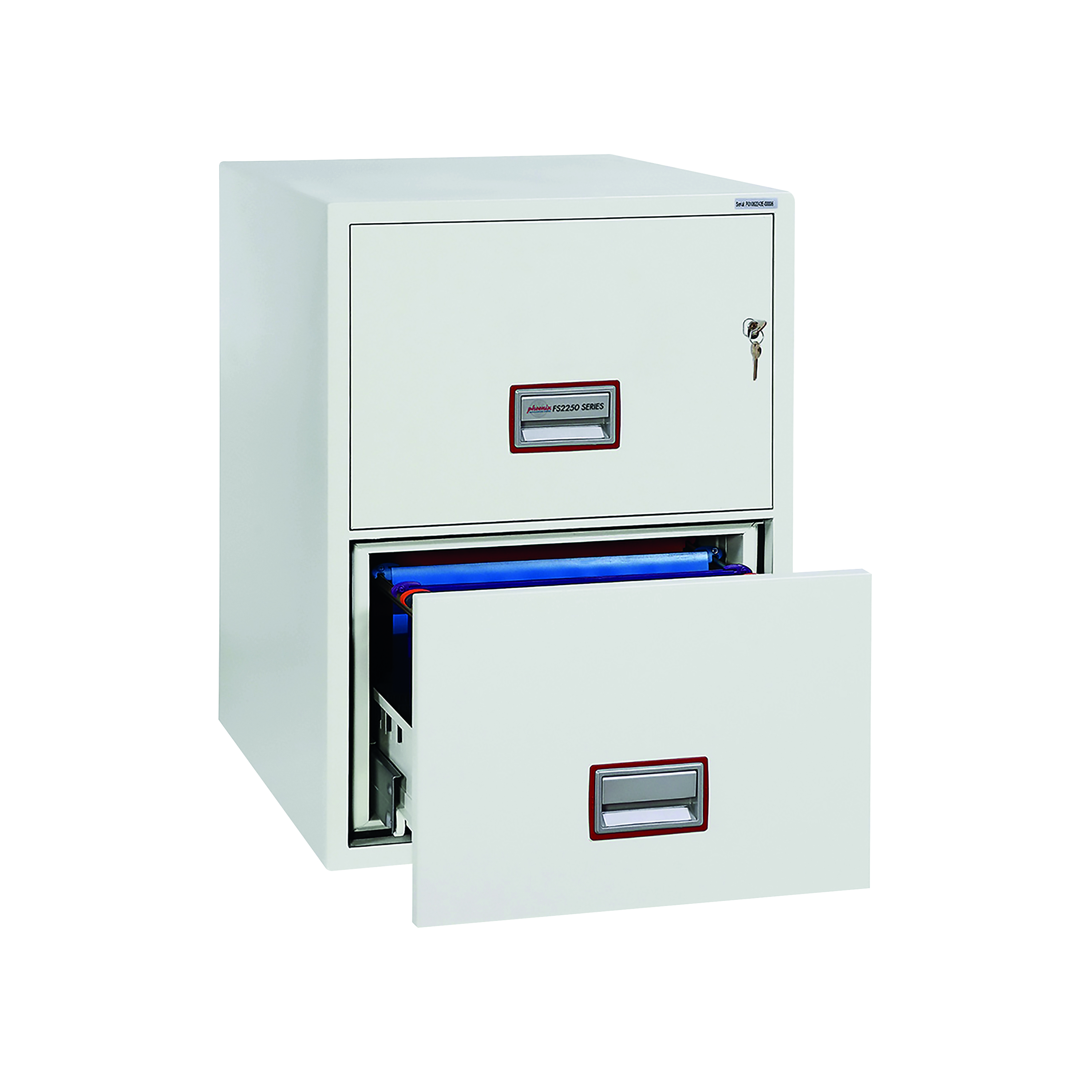 This vertical fire file two drawer safe provides up to 90 minutes of fire protection for paper documents and up to 60 minutes of fire protection for digital media. Featuring a key lock, this is a secure and user-friendly safe can accommodate a range of file sizes on its internal, width-adjustable rails.